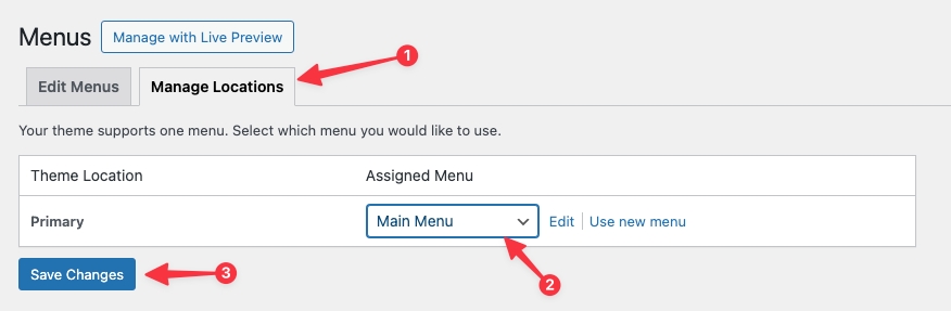 Click the Manage Locations tab to set your menu location.