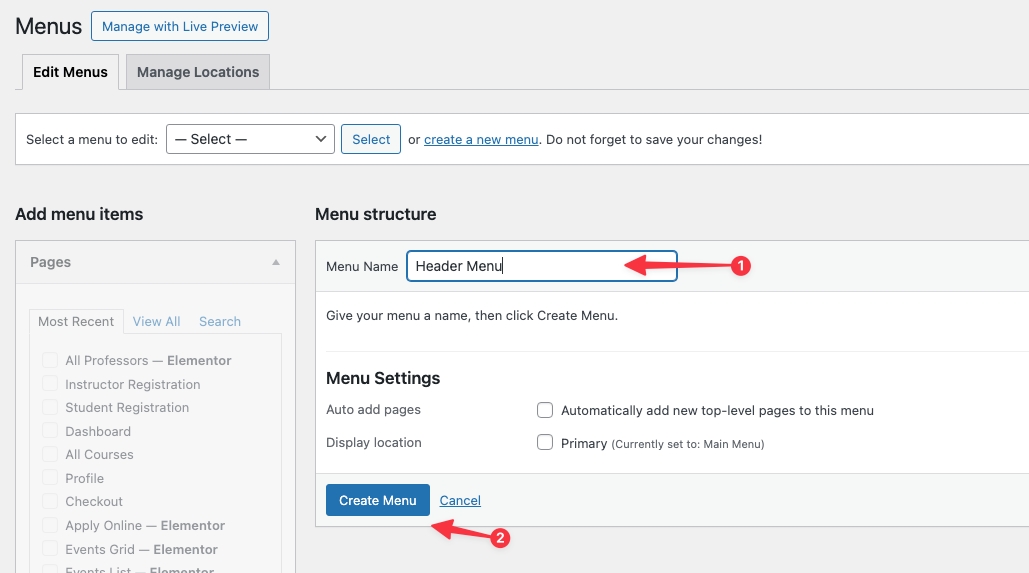 Go to Appearance → Menus in your admin sidebar and click Create a new menu option.