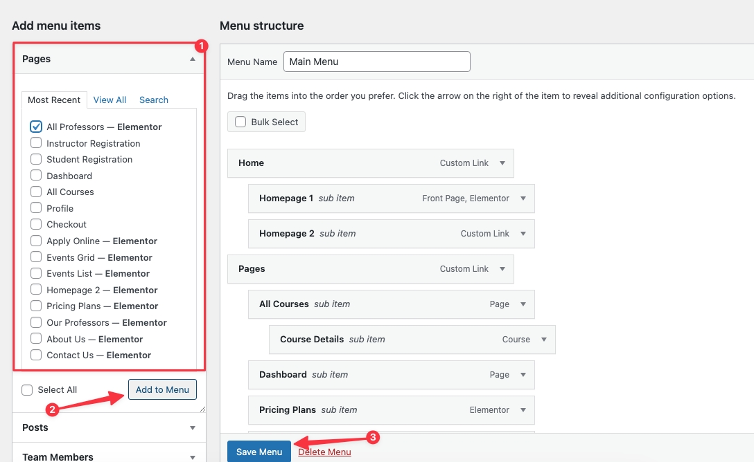 Choose the menu items you want to add from the left and hit Add to Menu. Then hit Save Menu.