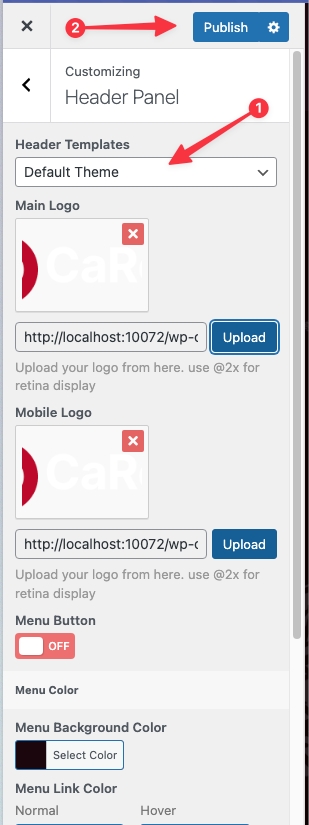 After setting up the Header layout, save the changes by clicking the Update Button, then Appearance → Customize → Header Panel, and select the New Page you added.