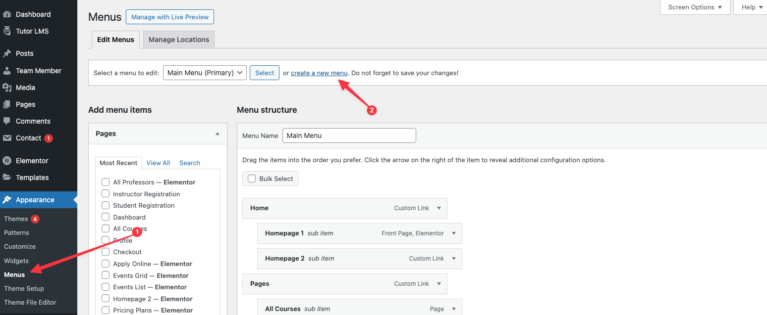 Go to Appearance → Menus in your admin sidebar and click Create a new menu option.